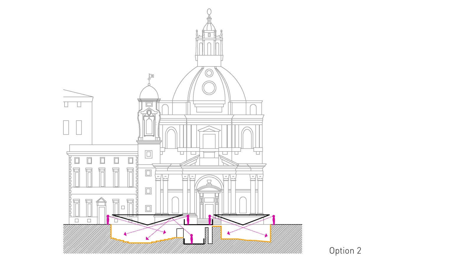 Per fare questo si è optato per una soluzione espositiva che lasciasse le murature antiche a vista all’interno dell’atrio della stazione in modo da farle divenire esse stesse fondali e rivestimenti dello spazio della metropolitana. Questa scelta è del tutto coerente con la scelta generale di strategia espositiva adottata nell’atrio della stazione: il viaggiatore viene immerso in uno spazio che vede l’alternanza da un lato di richiami storico/archeologici che descrivono in modo didascalico le antiche preesistenze, dall’altro da elementi contemporanei del nuovo progetto della stazione. Le aule vengono coperte da una struttura cieca in calcestruzzo sostenuta da muri a tergo delle aule e pilastri interni appositamente posizionati rispetto alle preesistenze.